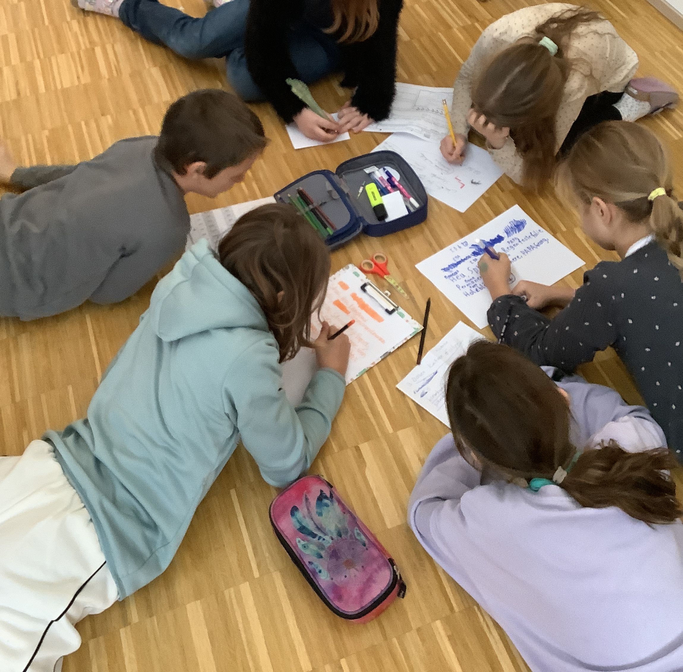 Eine Gruppe erstellt Mutmachkarten für Kinder im Krankenhaus, eine andere organisiert eine Sammelaktion für den guten Zweck. Zudem setzt sich eine Gruppe aktiv für die Umwelt ein, indem sie Müll sammeln und upcyceln.